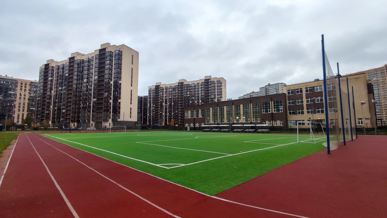 Футбольное поле у школы и жилых домов нового квартала