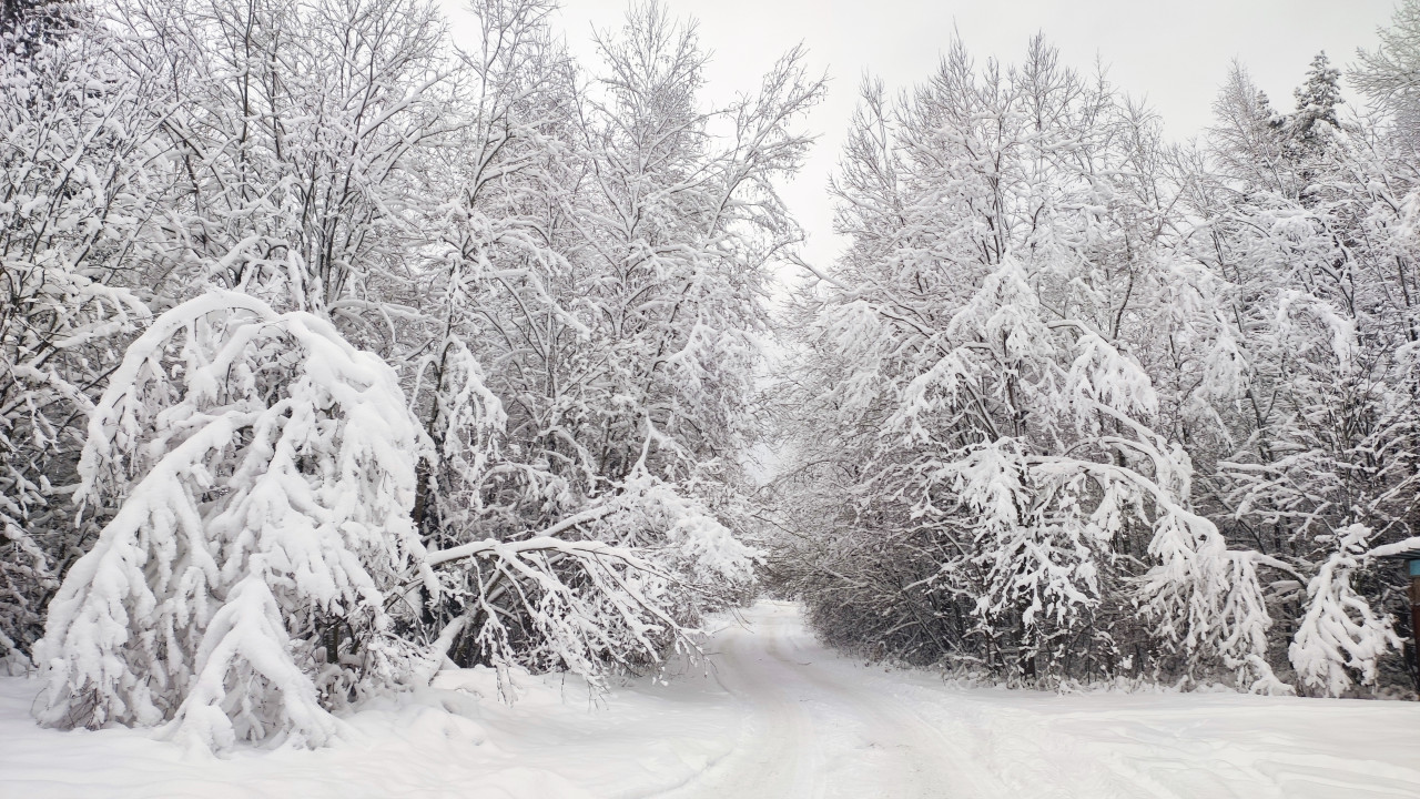 На фотографии показана узкая дорога, проходящая через лесной участок, покрытый свежим снегом. Ветви деревьев на обоих сторонах проезда сильно нагружены снегом, образуя над дорожкой дугообразный коридор. Видна плотная лесополоса, характерная для пригородных и сельских территорий, где отсутствует интенсивное движение транспорта и сохраняется естественный характер природного рельефа. Дорога не имеет твёрдого покрытия, по краям присутствуют снежные сугробы, что указывает на сезонность и непостоянную расчистку. Такое изображение может применяться в материалах о сезонных природных условиях, зимних пейзажах, рекреационных маршрутах, особенности эксплуатации загородных территорий в холодное время года, а также в контексте туристических и тематических публикаций о зимних лесах.