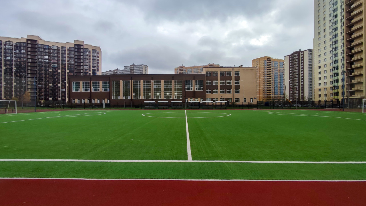 На фотографии изображено футбольное поле с искусственным зелёным покрытием и белой разметкой. За полем расположено здание школы с крупными окнами и соседние многоэтажные жилые дома. Погода пасмурная, что подчёркивает естественные цвета городского пейзажа. Снимок отражает современную организацию спортивной инфраструктуры в городской среде и может быть использован в публикациях о строительстве и благоустройстве образовательных учреждений.