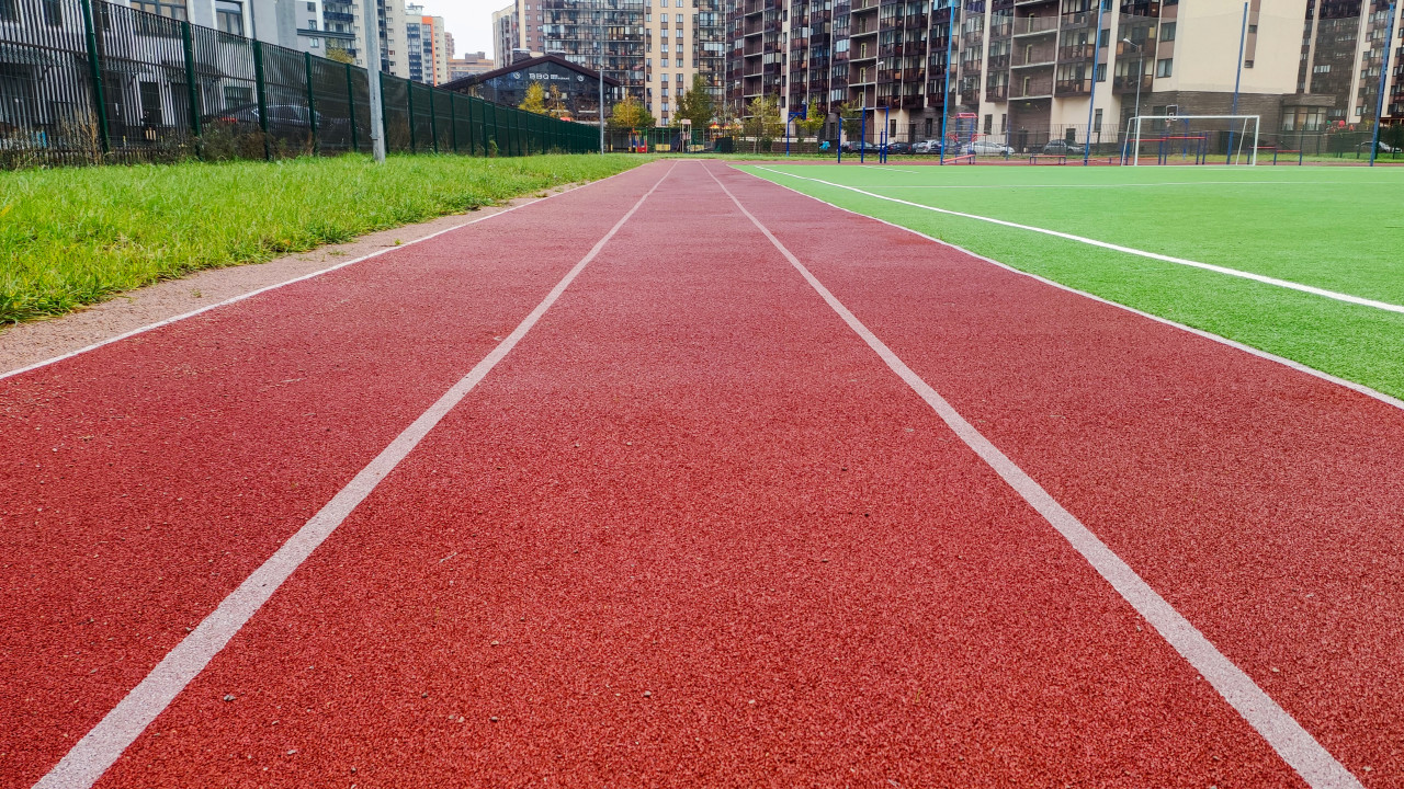 Красная беговая дорожка рядом с футбольным полем и жилыми домами
