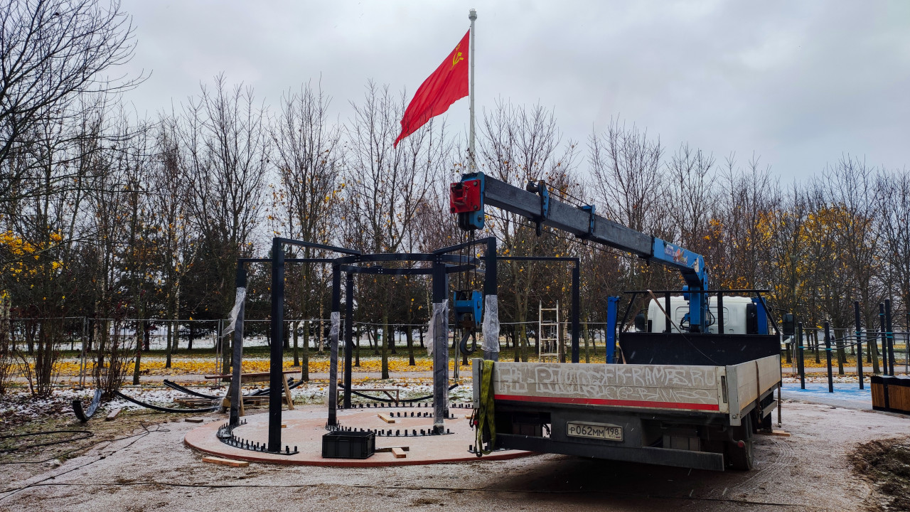 На фотографии показан участок монтажа металлической конструкции с участием автокрана. На заднем плане виден поднятый на флагштоке красный флаг с серпом и молотом — символ бывшего СССР. Работы ведутся на открытой площадке, покрытой тонким слоем снега, среди листопадных деревьев поздней осенью. В кадре присутствует грузовик с выдвинутой стрелой, строительные материалы и инструменты. Фото подходит для публикаций на темы инженерных работ, строительства малых архитектурных форм и символики советского периода.