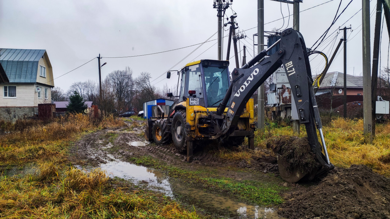 экскаватор volvo земляные работы техника строительство деревня грунтовая дорога инженерные сети подстанция электролиния коммунальное хозяйство механизация осень благоустройство инфраструктура дорога сельская местность техника на стройке строительная площадка лужи грязь ковш раскопки инженерные коммуникации подрядчик спецтехника развитие оборудование инженерные системы транспорт VolvoПохожие фотографии