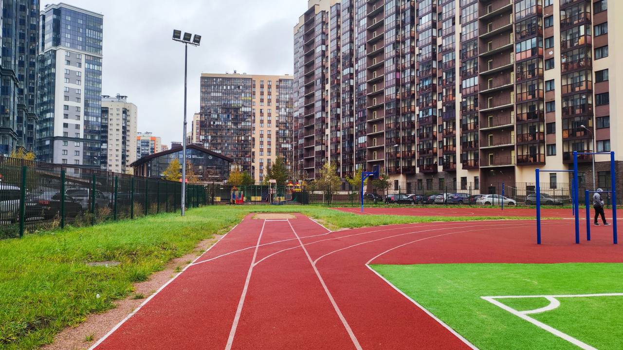 Легкоатлетические дорожки и футбольное поле во дворе жилого комплекса
