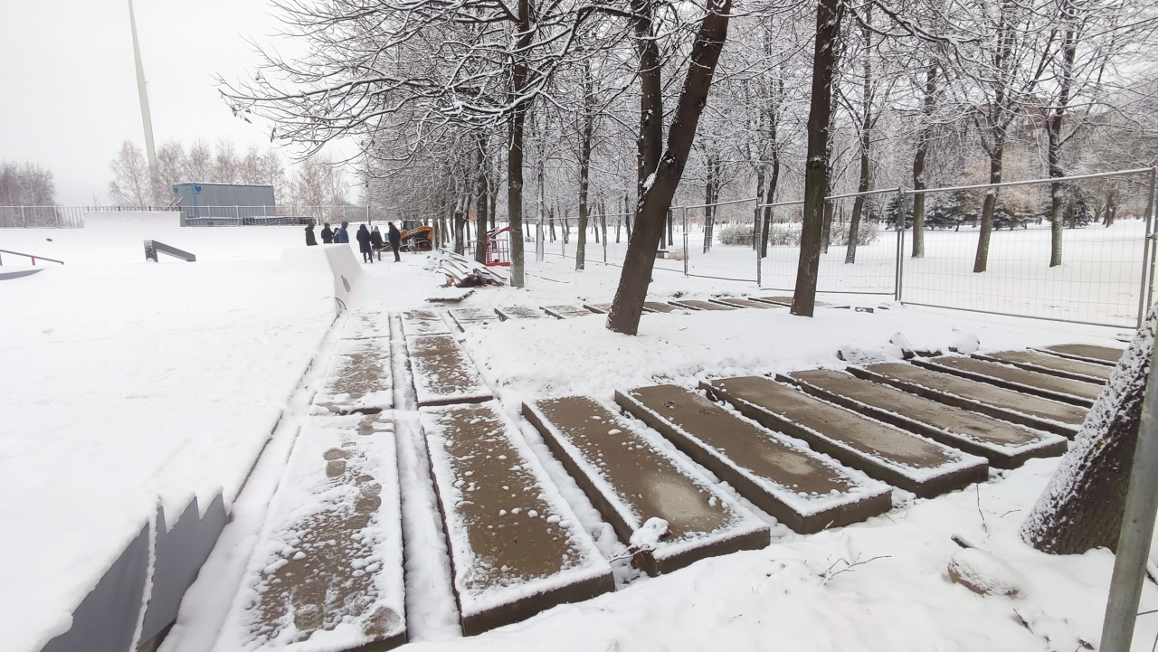 На изображении запечатлена территория возле скейтпарка, где уложены многочисленные бетонные плиты, формирующие временную пешеходную поверхность. В правой части кадра видна группа людей и строительная техника, а вдалеке — скейтпарк с ограждением. Деревья по периметру покрыты снегом, присутствует временный металлический забор. Сцена демонстрирует процесс благоустройства и реконструкции парковой территории в зимних условиях. Изображение может использоваться в контексте работ по подготовке инфраструктуры, организации пешеходных маршрутов и устройства покрытий.