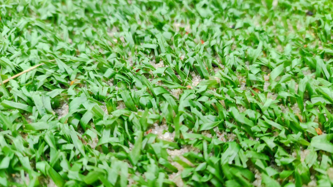 На фотографии представлен крупный план структуры искусственного газона: зелёные полиэтиленовые волокна и наполнитель из песка, обеспечивающий устойчивость покрытия. Такой тип покрытия применяется на футбольных полях и других спортивных площадках благодаря долговечности и простоте обслуживания. Снимок подходит для публикаций о спортивных материалах, строительстве и благоустройстве территорий.