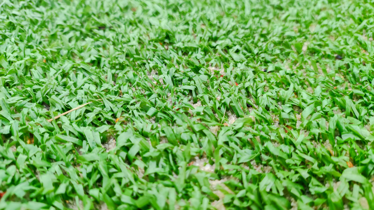 На макрофотографии изображён участок искусственного газона, где видны зелёные синтетические волокна и частицы песчаного наполнителя. Такое покрытие применяется на футбольных и многофункциональных спортивных площадках для равномерного распределения нагрузки и улучшения сцепления. Кадр можно использовать для иллюстрации строительных технологий, производства спортивных покрытий и материалов.