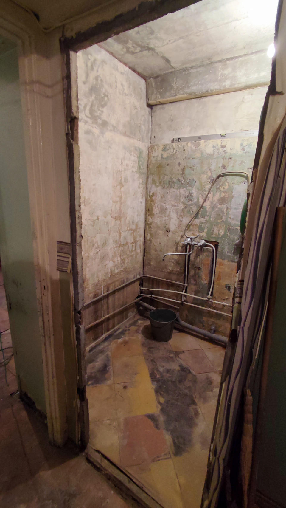 Фотография демонстрирует ванную комнату в процессе капитального ремонта. Стены очищены до бетона, частично сохранились фрагменты старой краски и плитки. Установлены водопроводные трубы и смеситель, на полу — ведро и следы влаги. Видно отсутствие облицовки и сантехники, что указывает на стадию подготовки помещения к полной отделке. Такой снимок подходит для материалов о строительных работах, ремонте, инженерных коммуникациях и реконструкции старых домов.