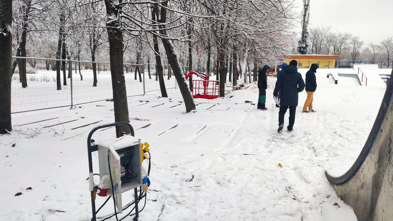 На фотографии изображён участок строительной зоны рядом со скейтпарком в городском парке, покрытый снегом. В левой части кадра установлен временный электрощиток на металлической стойке, к которому подведены кабели, используемые для подключения оборудования в процессе работ. На заднем плане видна красная монтажная площадка-кран балочной стойки и группа людей, осматривающих территорию. Покрытие земли частично перекрыто бетонными плитами, уложенными для временного прохода. Территория ограждена металлическим забором, а деревья вокруг покрыты снегом, что подчёркивает зимний сезон. Снимок подходит для материалов о благоустройстве, подготовительных работах и эксплуатации временной строительной инфраструктуры.