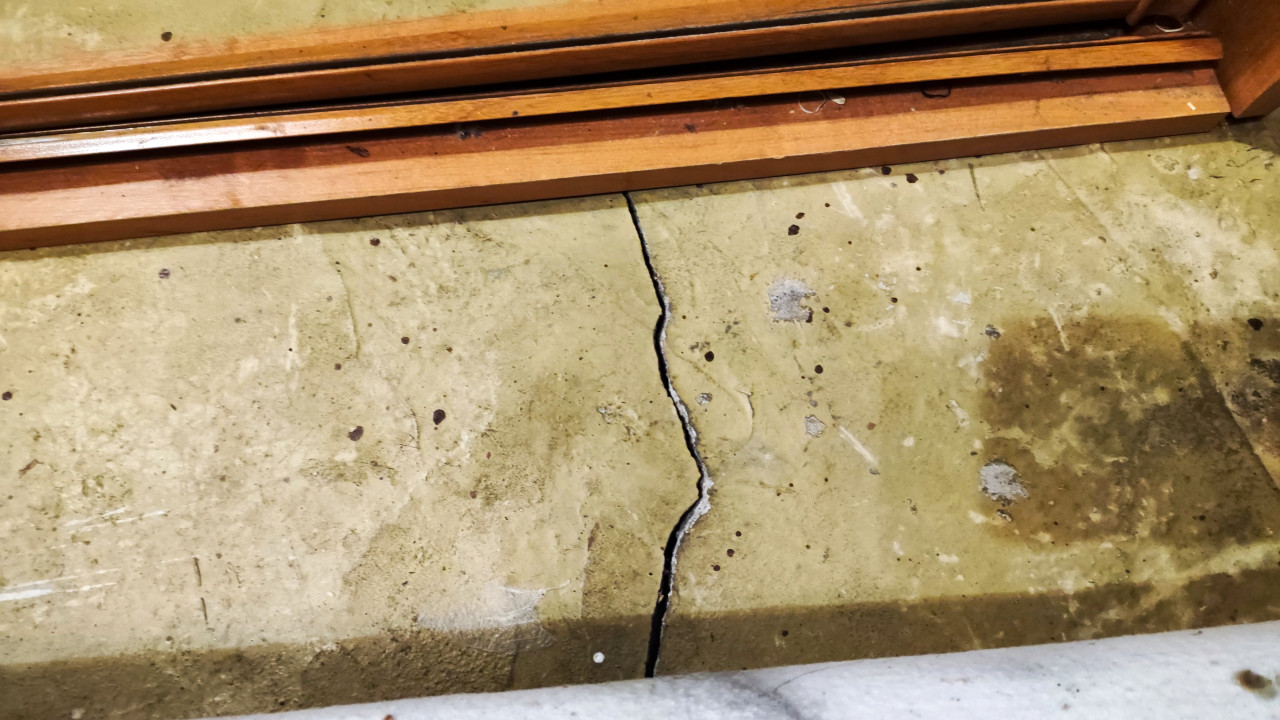 На изображении крупным планом показан участок бетонного пола с заметной трещиной, проходящей от деревянного порога. Поверхность имеет следы загрязнений и износа, характерные для помещений с высокой нагрузкой или недостаточной гидроизоляцией. Фото фиксирует строительный дефект, требующий последующего обследования и устранения. Такой снимок может использоваться в отчётах строительной экспертизы, при составлении технических заключений или в обучающих материалах по контролю качества строительных работ.