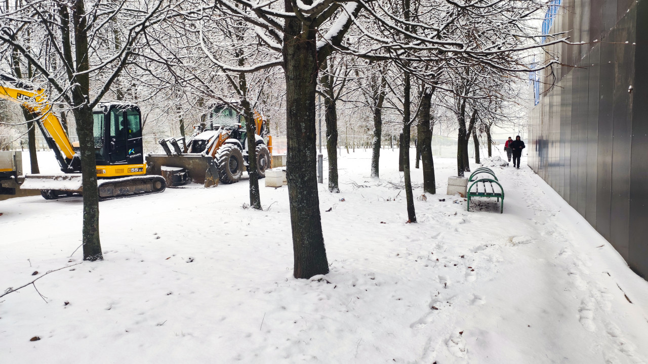 благоустройство благоустройство территории стройплощадка строительная площадка строительные работы строительство строительный участок спецтехника мини экскаватор погрузчик зима снег деревья техника на стоянке земляные работы городская инфраструктура дорожные работы подрядчик подготовка территории гусеничная техника фронтальный погрузчик эксплуатация техники сезонные работы строительный объект уличная среда безопасная зона временная площадка снегопад наружные работы скамья территория работ уличное пространствоПохожие фотографии