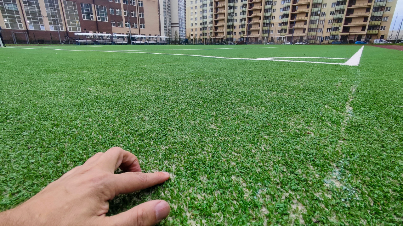 На фото крупным планом показана рука человека, касающаяся поверхности искусственного газона на футбольном поле возле школы. На заднем плане видны здание школы и жилые дома. Снимок демонстрирует структуру синтетического покрытия и толщину волокон, что позволяет оценить состояние и износ материала. Изображение может быть использовано для иллюстрации тем, связанных с контролем качества спортивных покрытий, техническим обслуживанием стадионов и безопасностью эксплуатации школьных спортплощадок.