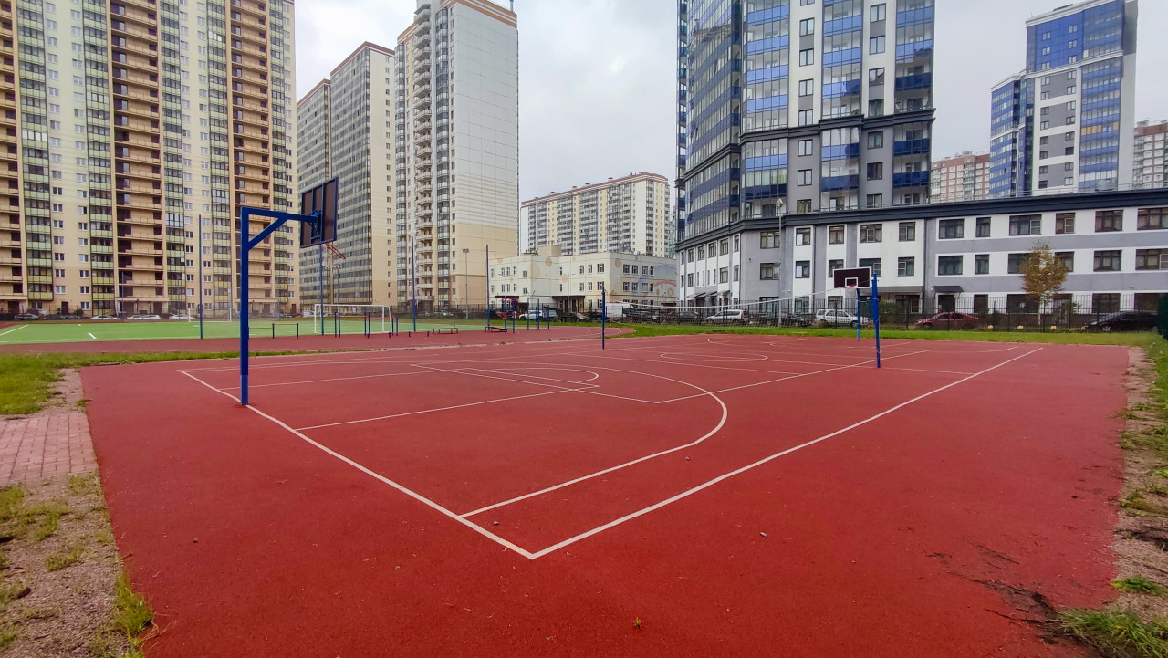 Баскетбольная площадка среди высотных жилых домов