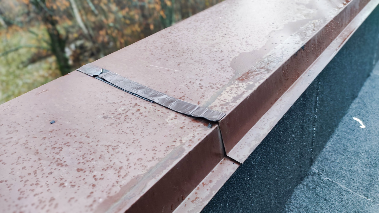 На снимке изображён участок парапета из листового металла, где на стыке установлена временная заплатка из ленты. Видна влажная поверхность с каплями дождя и следами коррозии, что указывает на нарушение герметичности. За краем крыши видны деревья без листвы и элементы благоустройства. Осенний сезон. Изображение подходит для статей и материалов о дефектах кровельных конструкций, обследовании зданий, ремонте и гидроизоляции стыков металлических элементов.