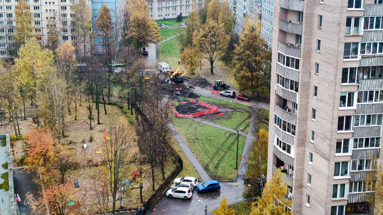 На фотографии показан участок двора в жилом районе Санкт-Петербурга, где ведутся земляные работы. В центре кадра экскаватор и трактор производят раскопку грунта, огороженного красными пластиковыми барьерами. Вокруг — деревья с осенней листвой, многоэтажные жилые дома советского периода, пешеходные дорожки и несколько припаркованных автомобилей. Местность типична для северных городов России, с плотной застройкой и зелёными дворами. Снимок можно использовать в публикациях о ремонте инженерных сетей, благоустройстве дворов, городской инфраструктуре и коммунальных службах.