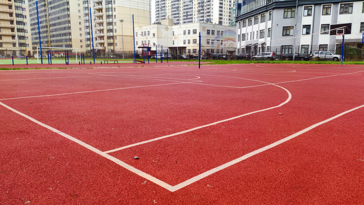 На фото изображена универсальная спортивная площадка с красным прорезиненным покрытием и белой разметкой. В кадре видны баскетбольные щиты, металлические стойки для волейбольной сетки и турники. На заднем плане — современное здание школы и жилые многоэтажки, формирующие плотную городскую застройку. Такое пространство используется для занятий физкультурой и спортивных игр на открытом воздухе. Снимок подойдёт для материалов о школьных дворах, организации спортивных зон, стандартах благоустройства и городской архитектуре.