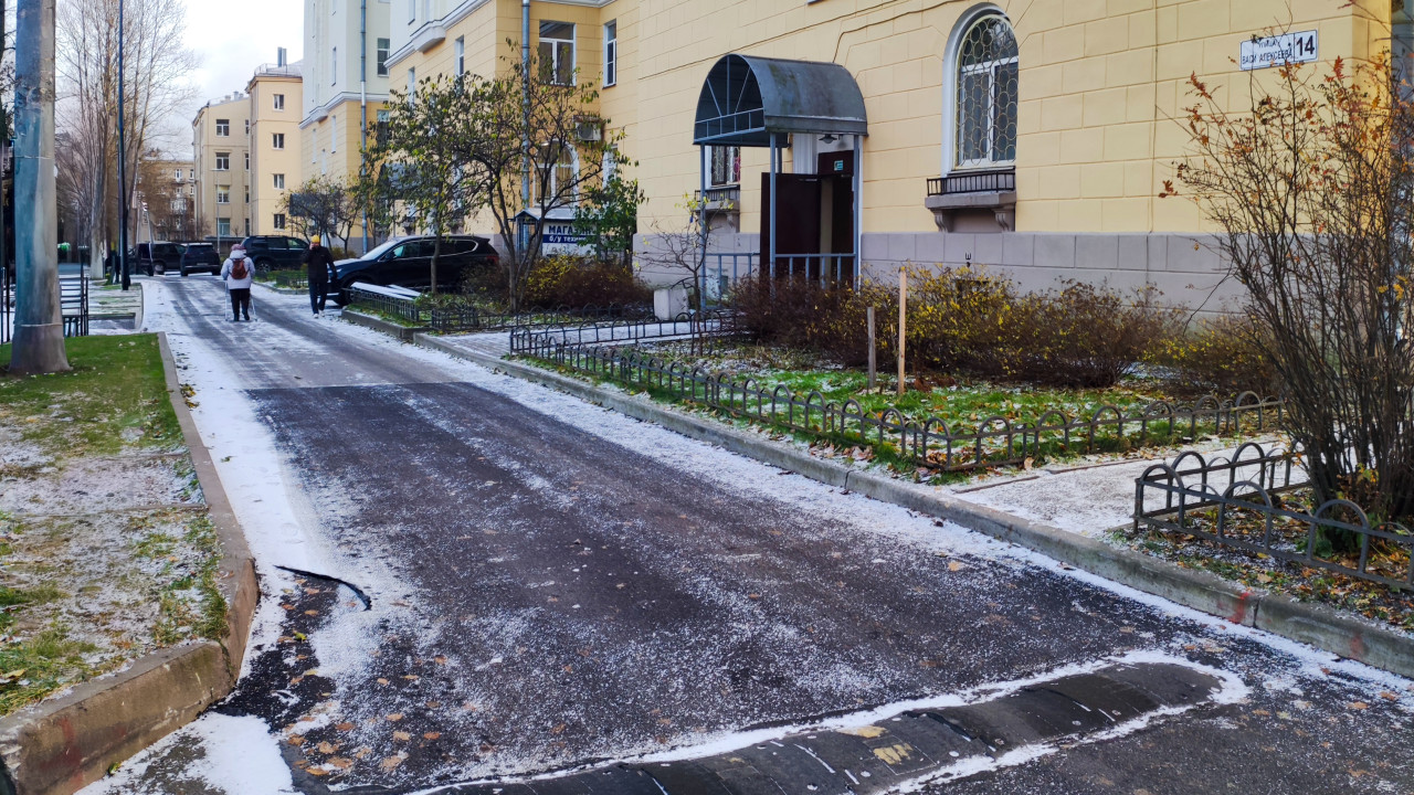 На фотографии показан участок дворовой дороги рядом с жилым зданием, фасад которого окрашен в жёлтый цвет. У обочин установлены металлические ограждения, отделяющие зелёные зоны с кустарниками. Видны следы первого снега и лёд на асфальтовом покрытии, а на переднем плане расположен лежачий полицейский. Вдоль проезда припаркованы автомобили, по тротуару идут пешеходы. Сцена отражает типичный вид придомовой территории в зимний сезон и может использоваться для иллюстрации благоустройства, дорожных работ и эксплуатации городских территорий.