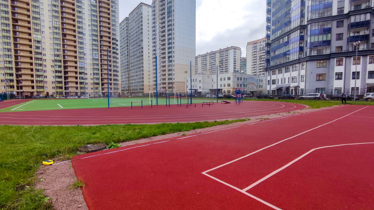 На фотографии показана крупная спортивная площадка с беговыми дорожками, футбольным полем с искусственным покрытием и зоной воркаута. Вокруг располагаются многоэтажные жилые дома и ограждение, обеспечивающее безопасность. Подобные площадки проектируются при благоустройстве новых кварталов для организации активного отдыха и массового спорта на свежем воздухе.