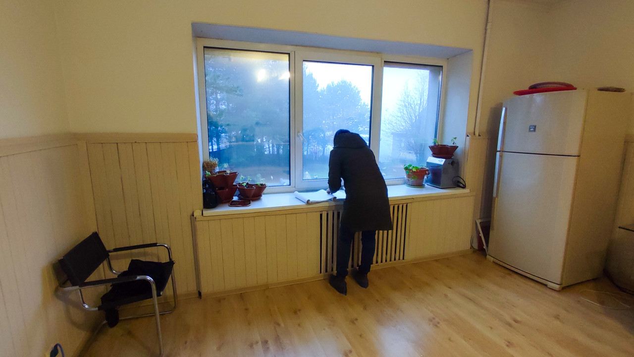На фото показано помещение с деревянной обшивкой стен и большим окном, выходящим на двор. Женщина в тёплой одежде осматривает подоконник, на котором расположены цветочные горшки. Справа стоит холодильник, слева — металлический стул с чёрным сиденьем. На полу уложено покрытие из светлого ламината. За окном видны деревья и слабый утренний туман. Сцена запечатлена в ходе технического осмотра или инвентаризации жилого помещения. Фото подходит для иллюстрации обследований зданий, строительных экспертиз и ремонта.