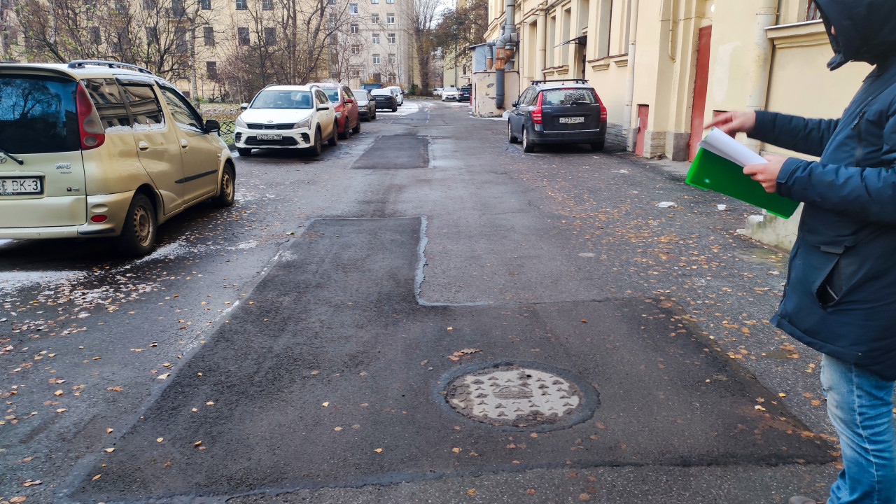 На фотографии изображён участок дворовой дороги с асфальтовым покрытием, на котором проведены частичные ремонтные работы. В центре кадра видны свежие заплатки и люк инженерных коммуникаций. По обе стороны проезда припаркованы автомобили, а справа человек в тёплой одежде держит папку с документами, вероятно, фиксируя состояние покрытия. Вдалеке — жилые дома с фасадами светлого цвета. Фото может использоваться в материалах о техническом надзоре, благоустройстве дворов и контроле качества дорожных работ.