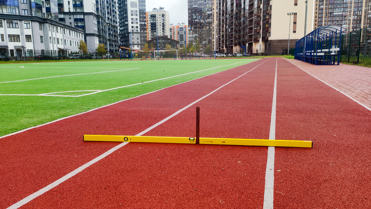 На фото запечатлён процесс измерения ровности покрытия беговой дорожки рядом с футбольным полем. На красной прорезиненной поверхности установлен строительный уровень и металлическая линейка, используемые для контроля высоты и уклона. Вокруг видны элементы спортивной инфраструктуры — искусственное футбольное покрытие, ворота, трибуны и современные жилые дома на заднем плане. Снимок отражает этап строительного контроля и технического надзора за качеством выполнения работ. Изображение можно использовать в материалах о строительстве, благоустройстве и контроле качества спортивных объектов.