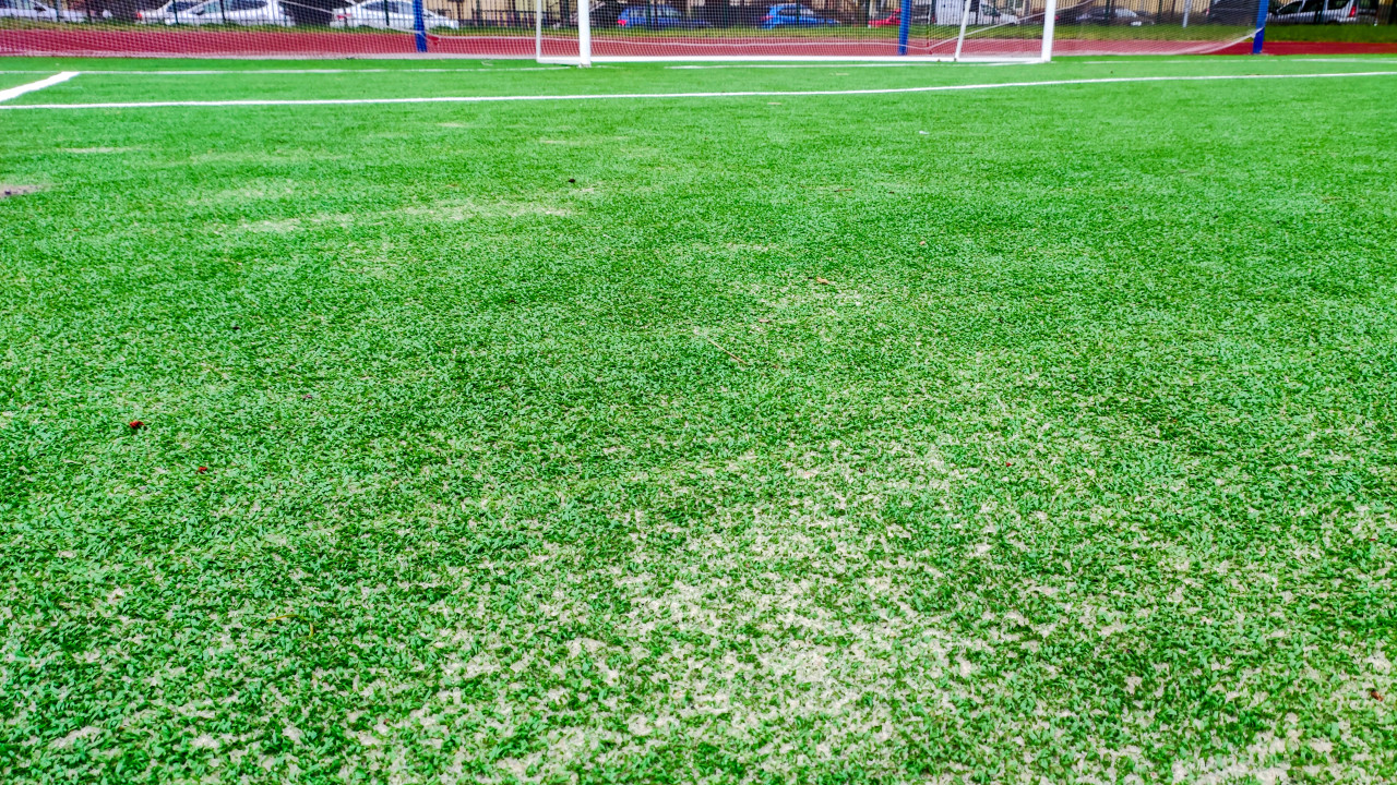 На фотографии показан участок футбольного поля с искусственным газоном и белой разметкой, переходящий в зону ворот. Видны следы эксплуатации покрытия и защитная сетка за воротами. На заднем плане расположены жилые здания, что указывает на расположение площадки в пределах жилого квартала. Фото подходит для материалов о строительстве, благоустройстве и обслуживании спортивных площадок.