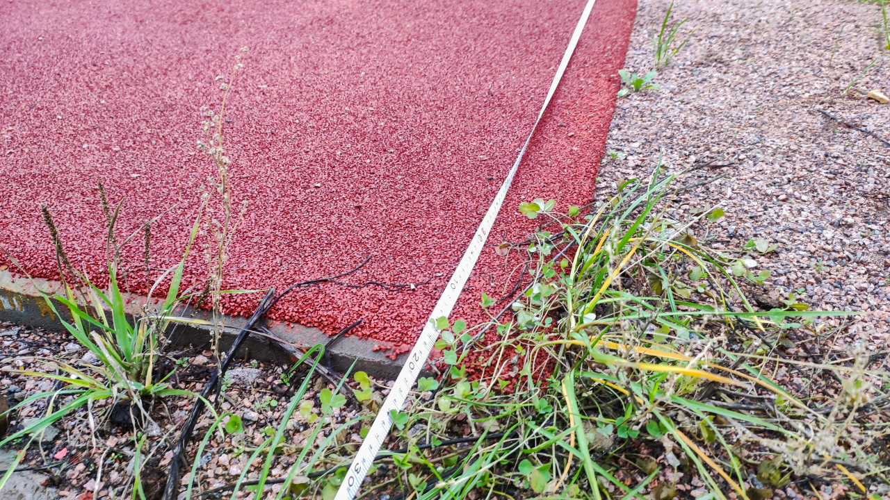 На снимке изображён участок спортивного покрытия из красной резиновой крошки, по краю которого проходит измерительная лента. Рядом видна растительность и щебёночное основание, примыкающее к площадке. Фото демонстрирует процесс измерения длины и точности укладки покрытия при техническом осмотре спортивных сооружений перед вводом в эксплуатацию.