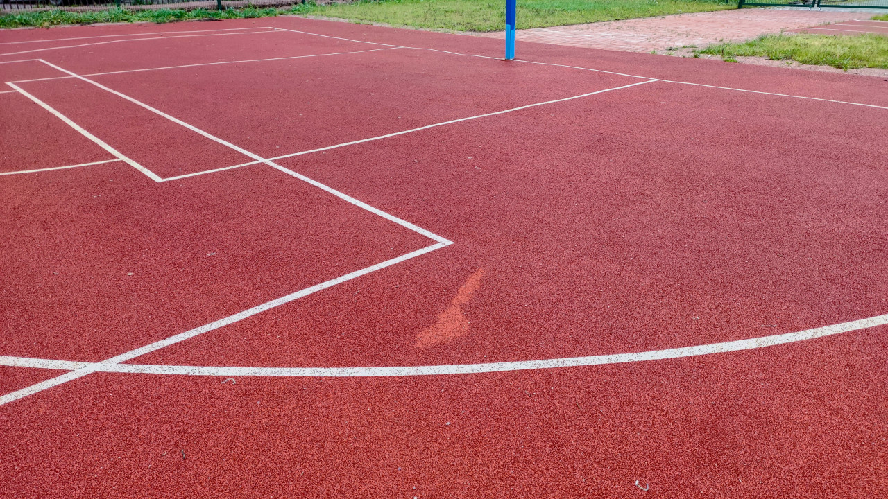 Поверхность спортивной площадки с дефектом покрытия и линиями разметки