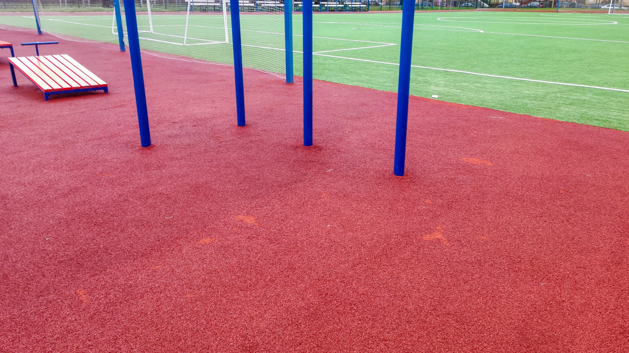 Зона турников и скамеек на спортивной площадке с резиновым покрытием