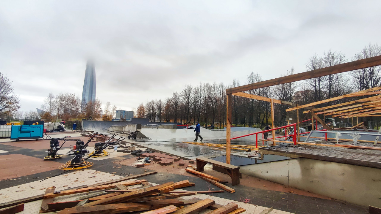 На фотографии изображён процесс ремонта и благоустройства спортивной площадки, вероятно, в городском парке. На переднем плане видны строительные материалы и оборудование для шлифовки бетона, а на заднем — рабочие, ведущие отделочные работы. Вдали различим шпиль высотного здания, частично скрытый туманом. Осенняя атмосфера и мокрое покрытие указывают на недавние осадки. Фото отражает этап реконструкции общественного пространства и может использоваться в темах о строительстве, городской среде и модернизации инфраструктуры.