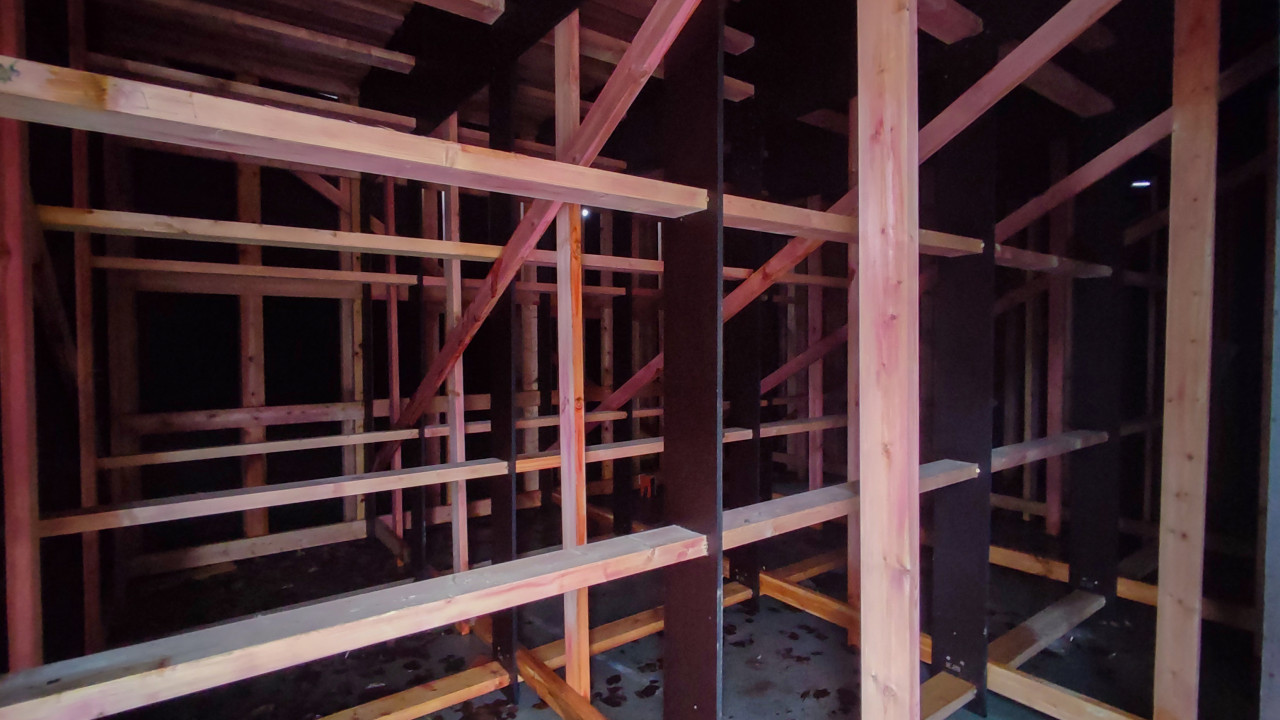 На снимке представлен внутренний вид деревянного каркаса, состоящего из множества перекрещивающихся балок и стоек, образующих пространственную решётку. Конструкция выполнена из строганого пиломатериала с антисептической обработкой, соединённого металлическими уголками. Свет проникает через проёмы, создавая ритмичный рисунок из линий и теней. На полу заметны следы осенних листьев, что свидетельствует о незавершённости работ и открытости сооружения. Фотография может быть использована для иллюстрации этапов монтажа деревянных построек, инженерных расчётов, проектирования каркасных систем и принципов пространственной жёсткости конструкций.