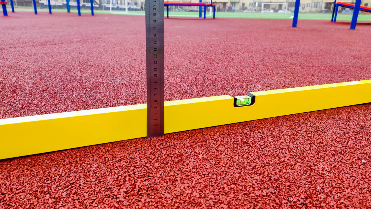 Измерение перепада высот на резиновом покрытии с помощью уровня и линейки