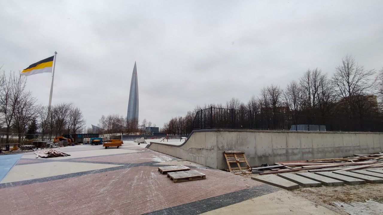 На фотографии изображена площадка скейт-парка на фоне башни «Лахта Центр» — современного архитектурного символа Санкт-Петербурга. На переднем плане видны бетонные элементы парка, деревянные поддоны и строительные материалы, что указывает на работы по благоустройству. На мачте слева развивается чёрно-жёлто-белый флаг. Поверхность площадки частично покрыта тонким слоем снега, деревья без листвы и пасмурное небо создают атмосферу поздней осени. Снимок можно использовать для публикаций о городской архитектуре, благоустройстве, спорте и строительных проектах в России.