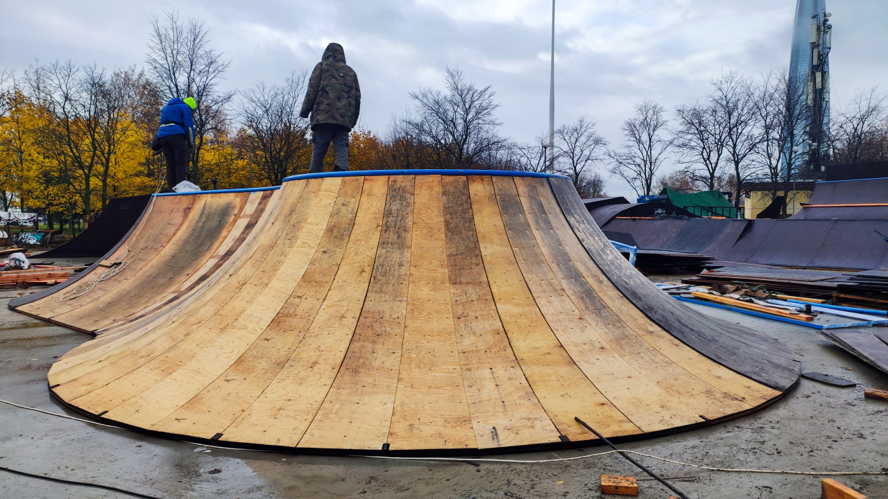 На фотографии двое рабочих находятся на деревянной рампе в процессе её обшивки и отделки. Конструкция выполнена из фанеры, закреплённой металлическими элементами. На заднем плане виден шпиль высотного здания и осенние деревья с жёлтой листвой. Фото фиксирует этап сборки спортивного объекта и демонстрирует технологию строительства уличных площадок. Снимок можно использовать для материалов о спортивной инфраструктуре, благоустройстве и современных строительных технологиях.