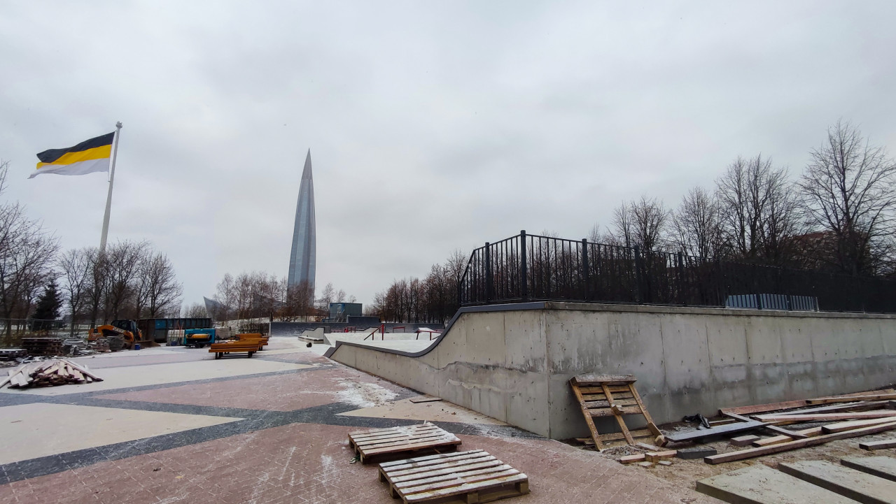 На снимке запечатлена бетонная площадка скейт-парка в Санкт-Петербурге, на заднем плане возвышается башня «Лахта Центр» — самое высокое здание Европы, построенное в 2019 году как штаб-квартира энергетической компании. На площадке лежат деревянные поддоны и строительные материалы, что указывает на завершение монтажных работ. Поверхность частично покрыта снегом, вокруг видны деревья без листвы и городская застройка. Фотография отражает сочетание современной архитектуры и спортивной инфраструктуры, а также сезонные особенности северного города.