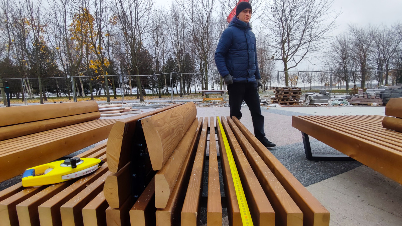 На фотографии изображен мужчина в зимней одежде, стоящий рядом с новыми деревянными скамейками в общественном парке. На лавке размещена рулетка и строительный уровень, что указывает на проведение измерений и осмотра объектов благоустройства. На заднем плане видны деревья без листвы, подмороженная земля и строительные материалы — вероятно, продолжаются работы по благоустройству общественного пространства. Сцена снята в холодное время года, предположительно поздней осенью или в начале зимы. Фото можно использовать в материалах о контроле качества благоустройства, городской инфраструктуре, урбанистике и проектировании общественных пространств.