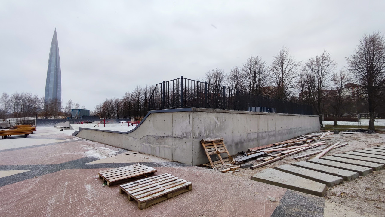 Элементы бетонного скейт-парка вблизи башни «Лахта Центр»
