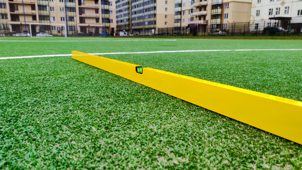 На снимке показан строительный уровень, лежащий на искусственном покрытии футбольного поля. Снято крупным планом, видна структура синтетического ворса и части белой разметочной линии. На фоне — жилые здания и ограждение спортивной площадки. Фото иллюстрирует проверку ровности поверхности при строительстве или техническом обслуживании искусственного поля. Подходит для статей о стандартах спортивных покрытий, строительных технологиях и инженерных измерениях.