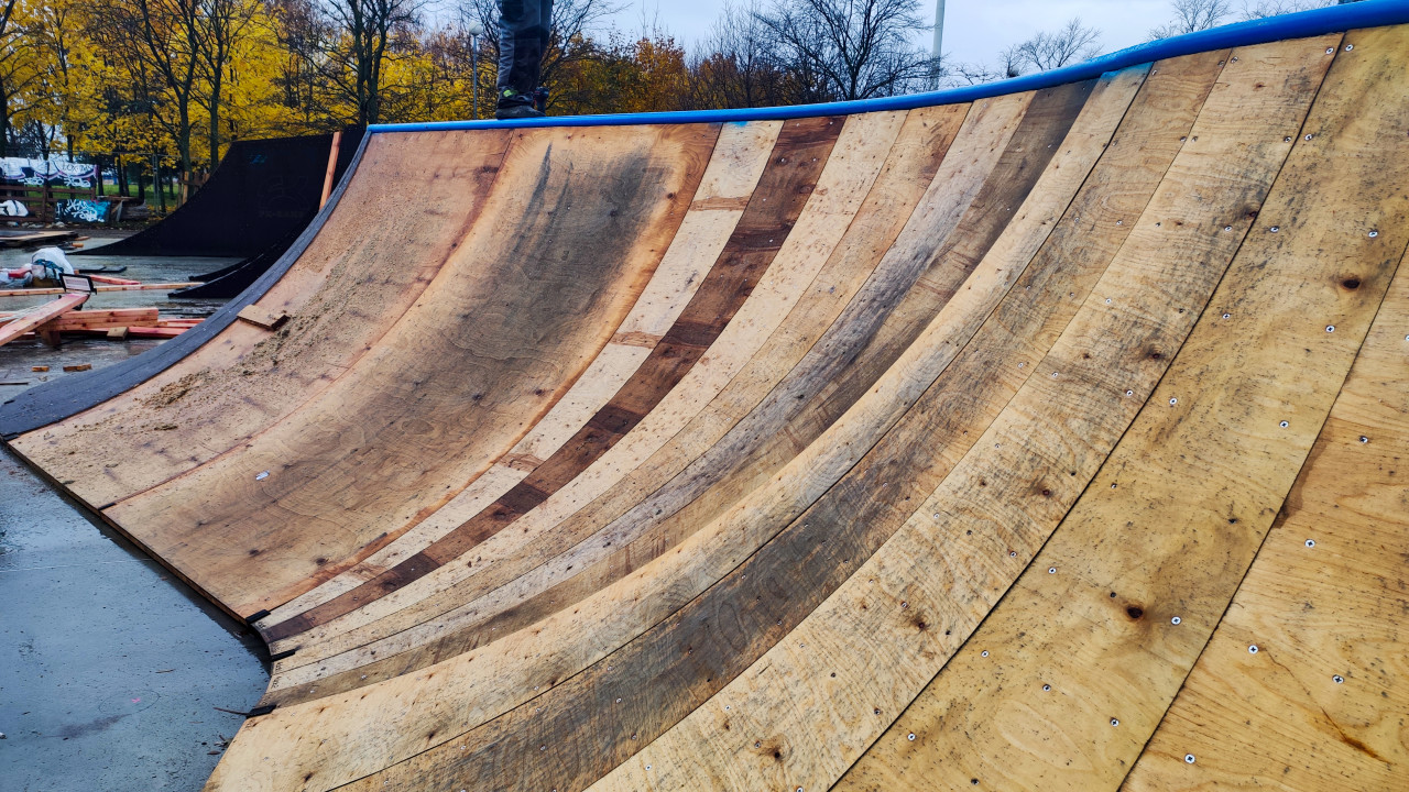 На снимке показан крупный план деревянной рампы, собранной из досок и фанеры, закреплённых металлическими элементами. Поверхность конструкции имеет плавный изгиб, характерный для скейт-парков. На фоне видны деревья с осенней листвой и другие элементы строительства. Фото демонстрирует процесс сборки спортивной инфраструктуры и может быть использовано для тематик, связанных с инженерными решениями и архитектурным дизайном малых форм.