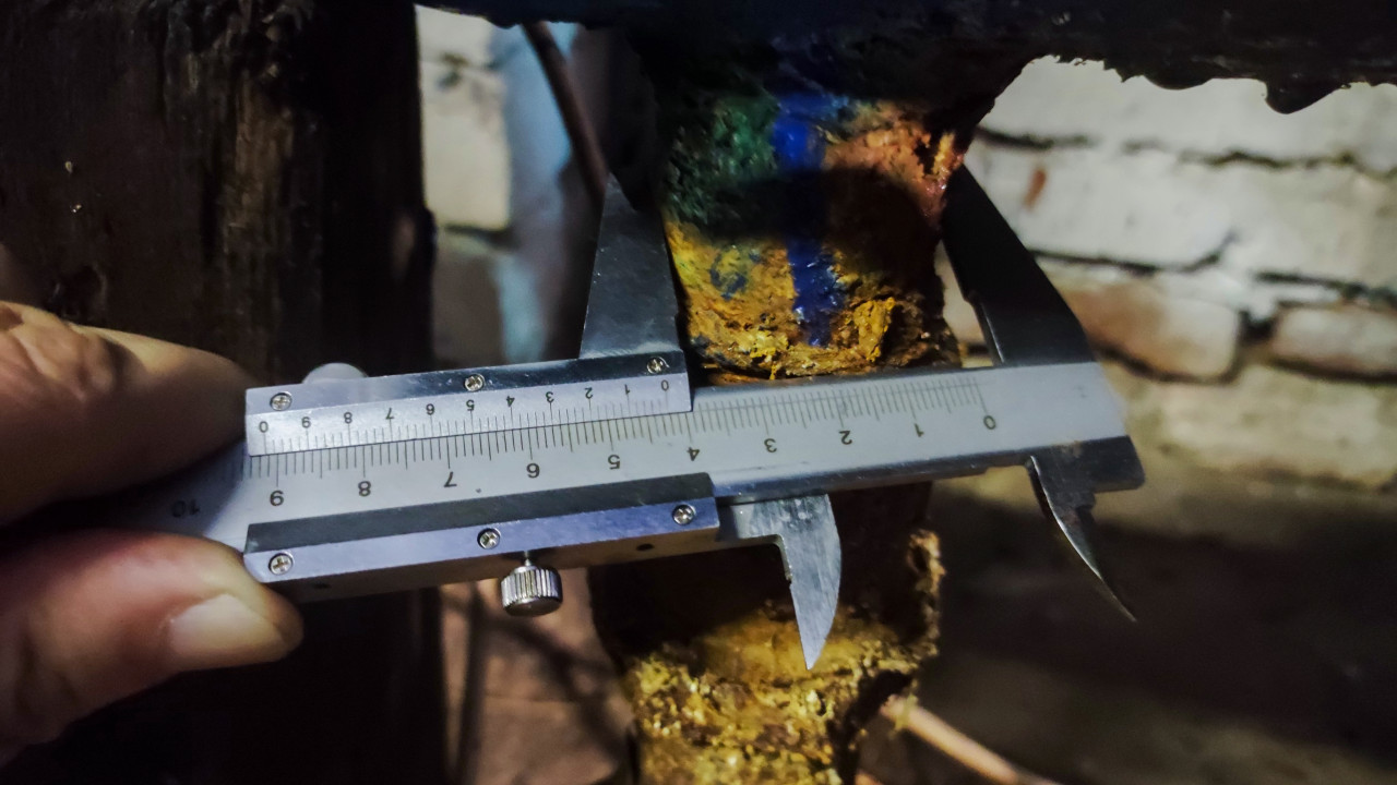 На изображении показан штангенциркуль, которым выполняется измерение наружного диаметра вертикальной металлической трубы небольшого сечения. Узел окрашен в разные оттенки из-за старых и новых слоев краски и следов коррозии, что указывает на длительную эксплуатацию оборудования. Деталь расположена вблизи основания трубной системы, предположительно на участке подключения к основному трубопроводу. В кадре видна рука оператора, удерживающего инструмент, что подтверждает процесс измерения. Снимок фиксирует состояние трубной части с визуальными признаками износа и может использоваться в отчетах по обследованию инженерных сетей и подготовке документации по ремонту.