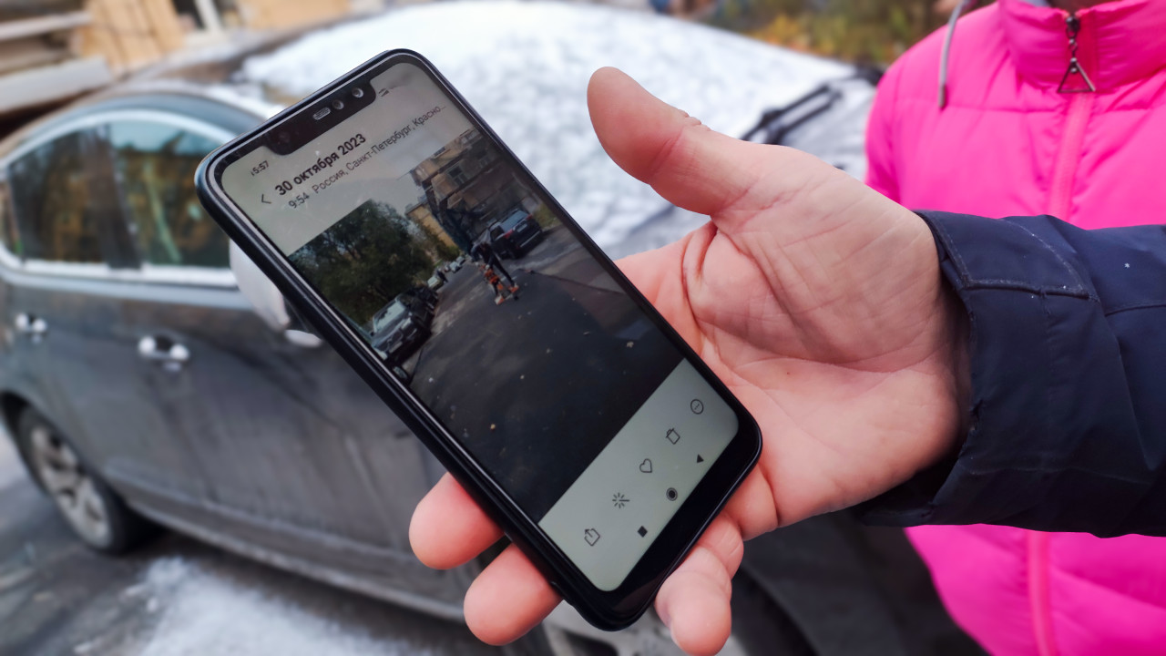На снимке показана рука человека, держащего смартфон с открытой фотографией участка дороги, сделанной ранее. На фоне виден припаркованный автомобиль, частично покрытый снегом, и фасад жилого дома. На экране устройства отображается дата и место съёмки — Санкт-Петербург, октябрь 2023 года. Кадр демонстрирует процесс фотофиксации состояния дорожного покрытия и может использоваться в материалах о техническом контроле, фотоотчётности, мониторинге работ и управлении городскими территориями.