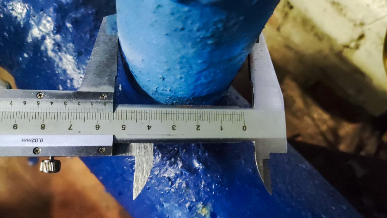 На фото показан процесс измерения наружного диаметра вертикального ответвления, выходящего из основной горизонтальной трубы. Узел окрашен в синий цвет и установлен на стальной линии, размещённой горизонтально вдоль стены. Измерение выполняется штангенциркулем, инструмент установлен вокруг патрубка, фиксируя значение. В кадре видны следы старой краски и шероховатость поверхности, характерная для эксплуатационных условий. Фото подходит для иллюстрации технадзора, обследования инженерных коммуникаций и документирования параметров трубопроводов.