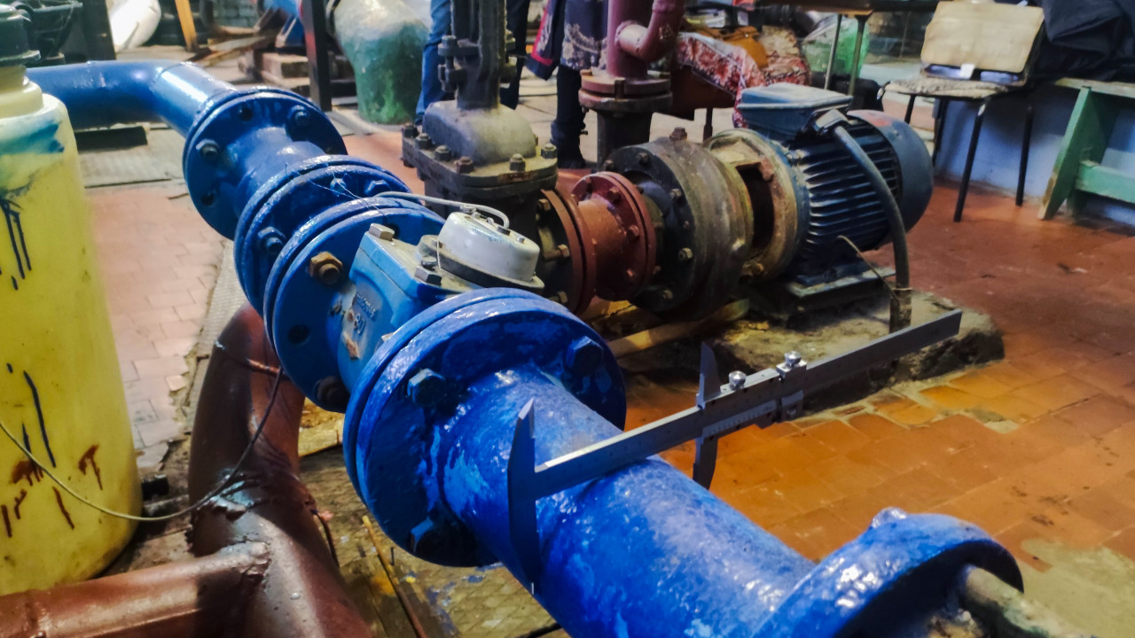 На фото показан участок синего трубопровода, проходящий вдоль пола и соединенный через фланцы с насосным агрегатом. Рядом располагается электродвигатель и участок красной магистральной линии, входящей в состав котельной. На трубе установлен штангенциркуль, указывающий на проведение измерительных работ. Снимок демонстрирует эксплуатационный узел инженерной инфраструктуры, где выполняется техническая проверка размеров и состояния трубопровода.