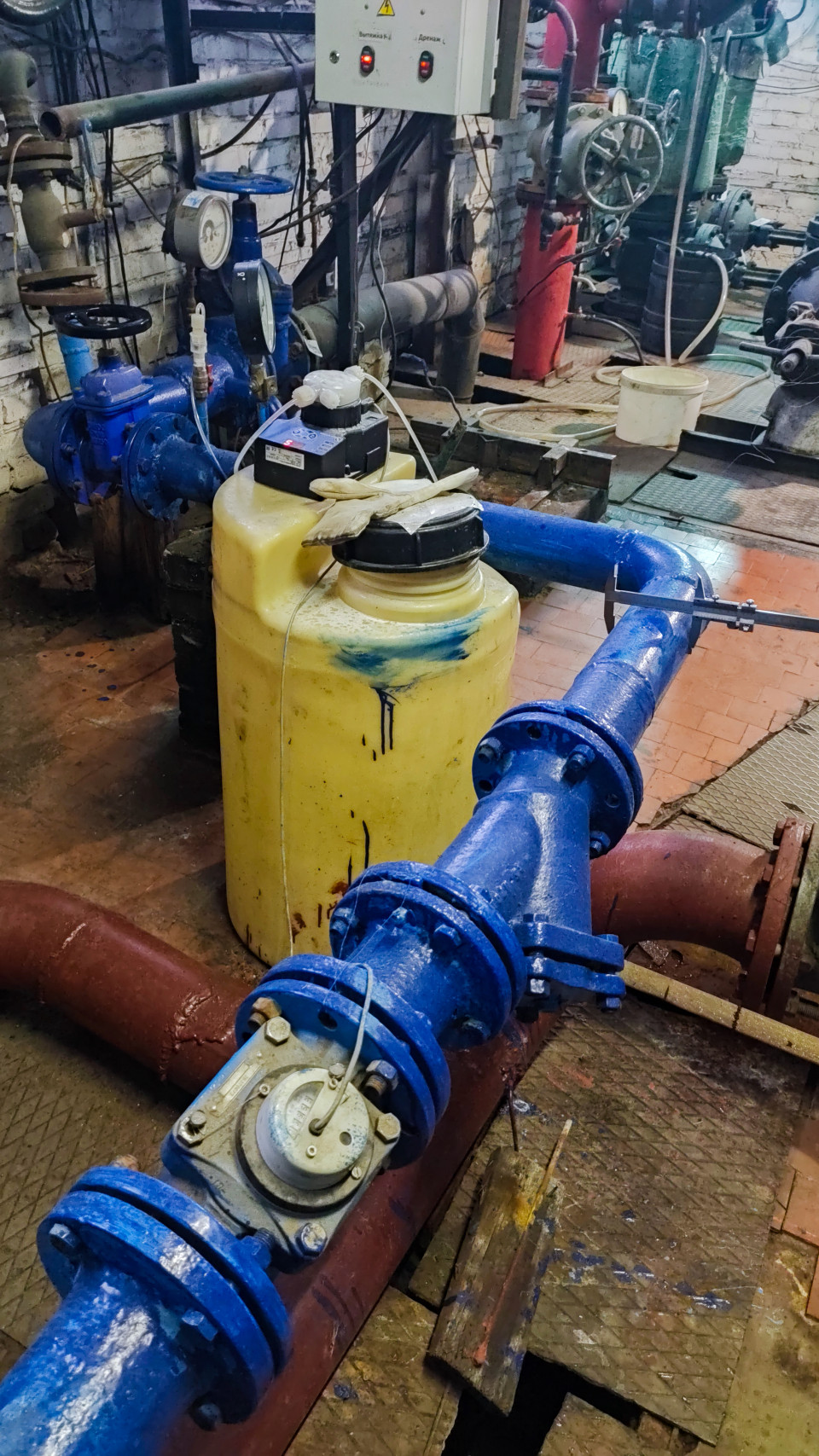 На изображении виден трубопровод в составе насосного узла, рядом с которым установлена пластиковая емкость для технологической жидкости, вероятно реагента или химдозатора. На переднем плане труба в синем защитном покрытии, к которой приложен штангенциркуль для измерения наружного диаметра. Рядом присутствуют фланцевые соединения, приборные кабели, элементы автоматизации и трубная арматура. Помещение имеет характерные признаки производственного объекта: кабельные трассы, металлический настил, смонтированное насосное и трубопроводное оборудование. Кадр подходит для иллюстраций по теме промышленной эксплуатации, обслуживания систем дозирования реагентов и контроля состояния инженерных сетей.