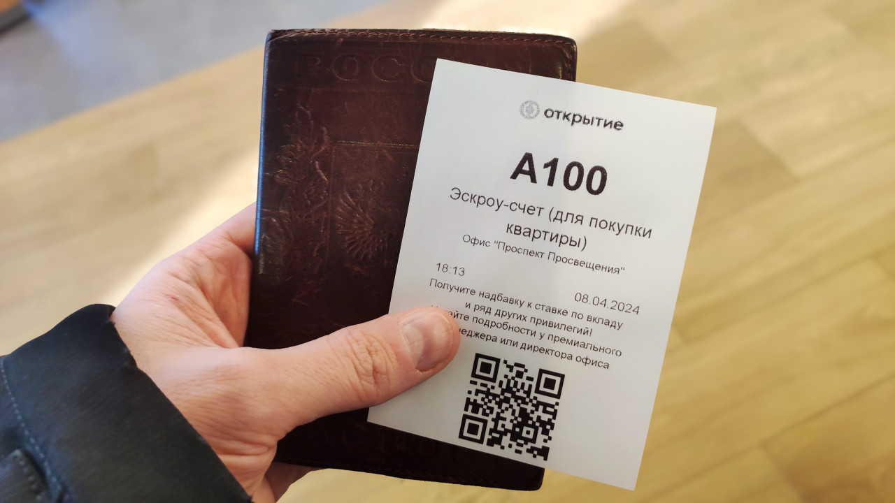На снимке показан талон электронной очереди с номером «А100» для оформления эскроу-счёта при покупке квартиры, выданный в офисе банка. Талон удерживается в руке вместе с паспортом гражданина РФ, что подчёркивает банковскую идентификационную процедуру. На талоне указано время приёма и QR-код, используемый для дополнительной верификации или информирования. Изображение отражает этап работы с финансовыми инструментами в рамках сделок с недвижимостью и может применяться в материалах о банковском обслуживании, ипотечных операциях и цифровых сервисах очередей.