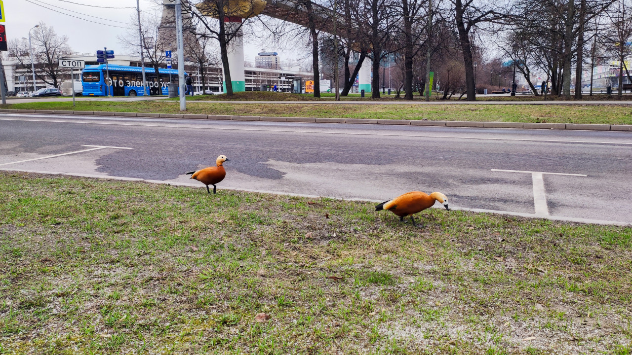 На фотографии показаны два огаря — вид водоплавающей птицы семейства утиных — находящихся на газоне вдоль проезжей части. На заднем плане виден городской общественный транспорт и пешеходная инфраструктура, что демонстрирует сосуществование городской среды и дикой фауны. Сцена характерна для весеннего периода, когда птицы выходят на открытые участки для кормления. Изображение подходит для материалов о городской орнитофауне и экосистемах мегаполиса.