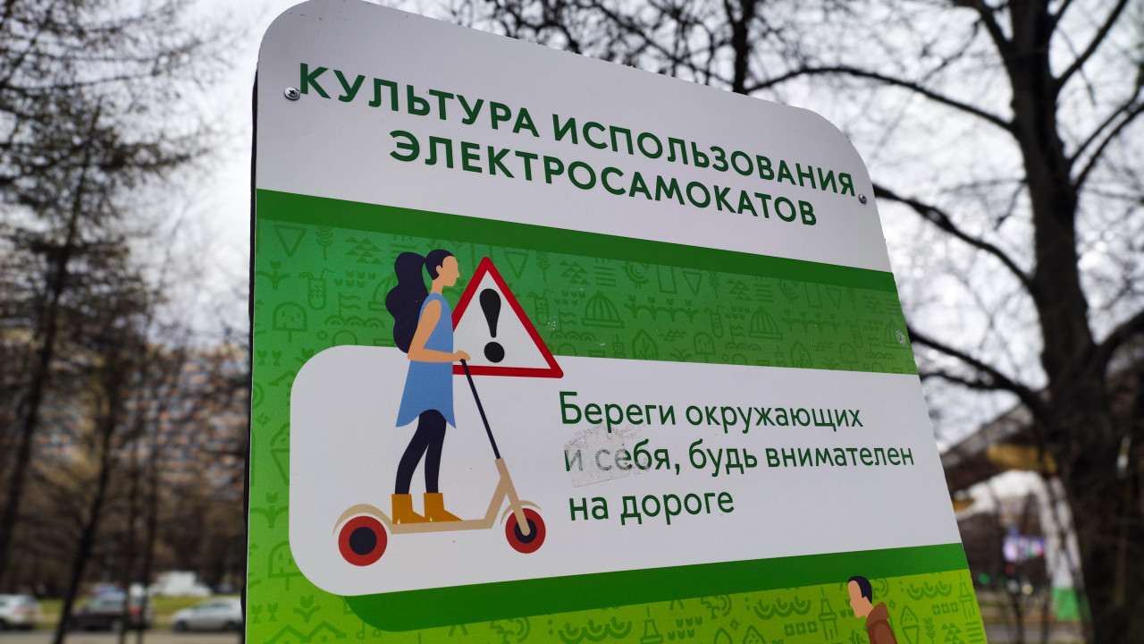 На снимке изображён уличный информационный щит с текстом на русском языке о культуре использования электросамокатов, с изображением человека на самокате и предостереждающим знаком. Щит расположен в общественном пространстве, что указывает на локальные меры по регулированию персонального электротранспорта. Этот материал может применяться в тематических статьях о городской мобильности, общественных правилах и безопасности пешеходных зон.
