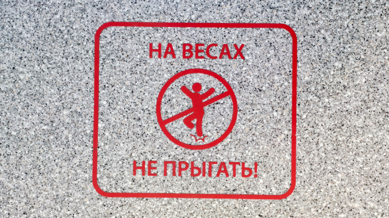 Фотография демонстрирует предупреждающий знак с надписью на русском языке, размещённый на шероховатой каменной поверхности. Пиктограмма изображает человека в движении с диагональной линией запрета, указывая на необходимость соблюдения правил эксплуатации площадки или устройства, обозначенного словом «весы». Типография и контур подчёркивают регламентирующий характер знака. Изображение подходит для материалов о технике безопасности, визуальных стандартах и пиктографике в общественных местах.