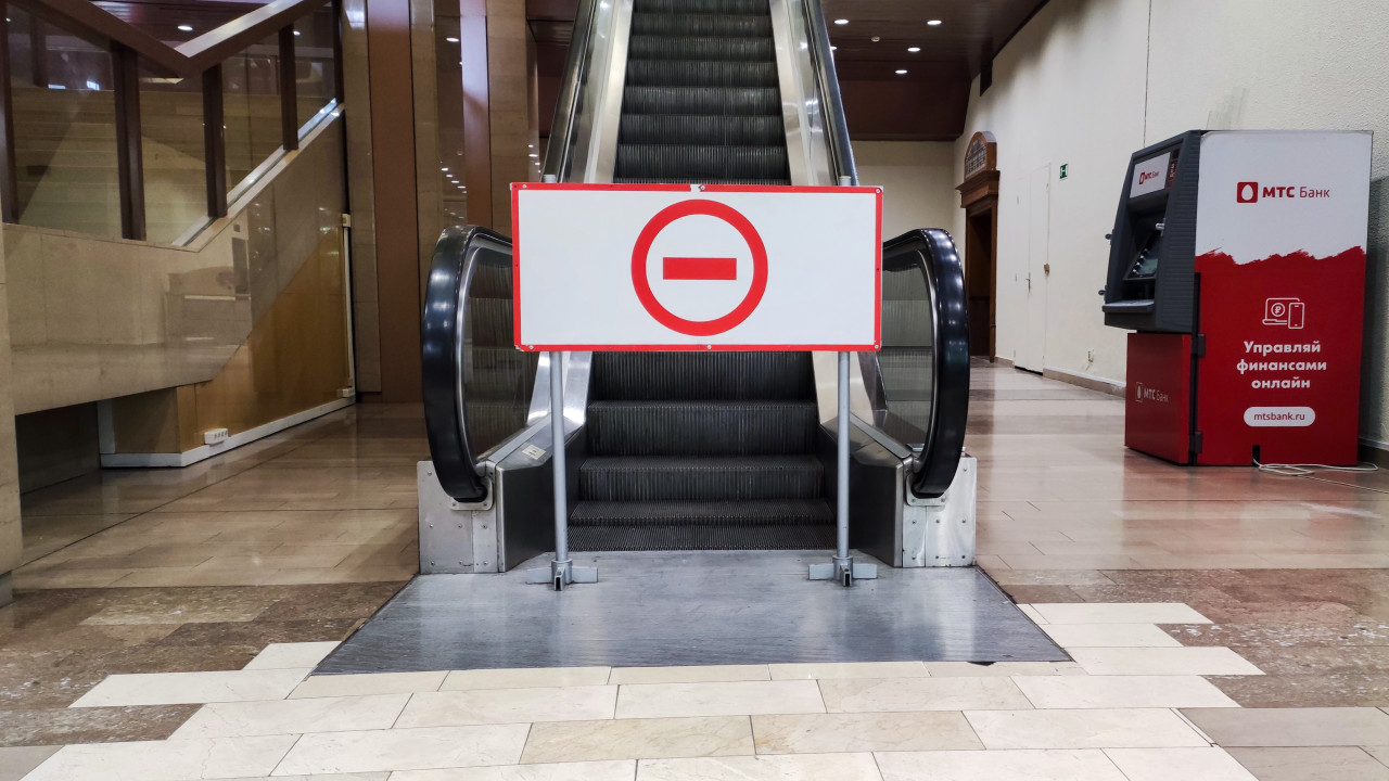 На изображении показан эскалатор в общественном здании с установленным перед ним большим знаком «вход воспрещён». Слева видна лестница и перила, справа — банкомат МТС Банка. Пол выполнен из мраморных плит, потолок оборудован точечным освещением. Сцена типична для административных или торговых зданий в России. Фотография может использоваться для иллюстрации транспортной безопасности, обслуживания техники и навигации в общественных пространствах.