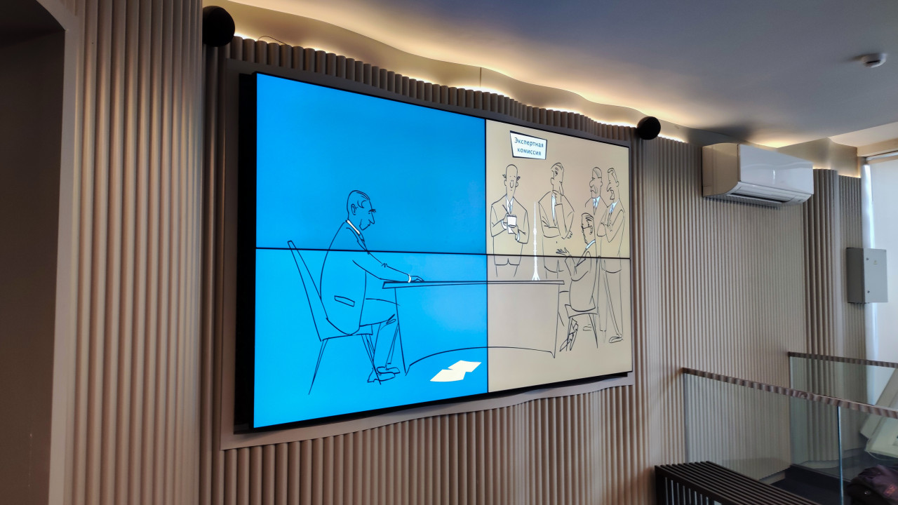 Фотография демонстрирует мультимедийную видеостену внутри Останкинской телебашни, на которой отображена графическая сцена заседания комиссии, выполненная в минималистичном стиле. Экран встроен в современный интерьер с декоративными панелями и подсветкой. Башня является объектом инженерного и архитектурного значения, построенным в 1967 году и функционирующим как туристический и просветительский центр. Кадр подходит для публикаций о мультимедийных экспозициях и музейных форматах подачи информации.