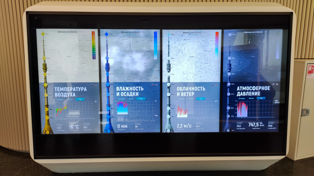 останкинская башня москва интерактивный экран информационная панель цифровая визуализация Останкинская башня метеоэкран метеоданные температура влажность атмосферное давление экспозиция интерактивная панель Москва туризм научпоп инженерное сооружение телерадиовещание внутренняя экспозиция наблюдения техника информационный стенд музейная среда климат экскурсия высотное здание публичный показ метеостанция посетителиПохожие фотографии